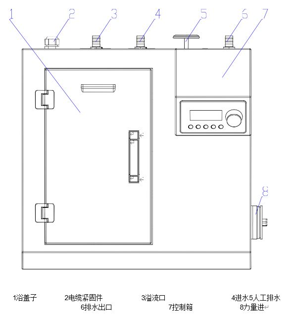 1浴蓋子 2電纜緊固件 3溢流口 4進(jìn)水5人工排水 6排水出口 7控制箱 8力量進(jìn)
