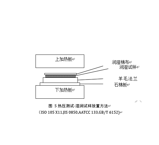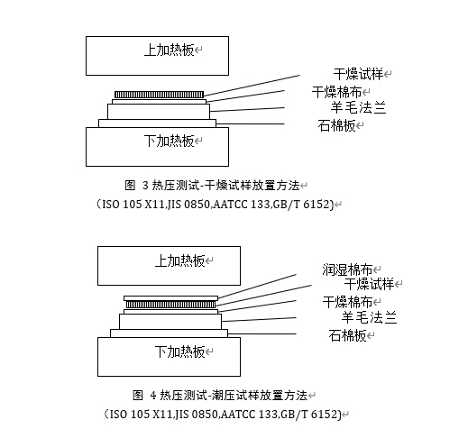 測試織物經(jīng)過熱壓后的顏色變化和色轉(zhuǎn)移程度,熱壓織物可以為干燥、調(diào)濕和潮濕三種,通常由紡織品終的用途來確定。